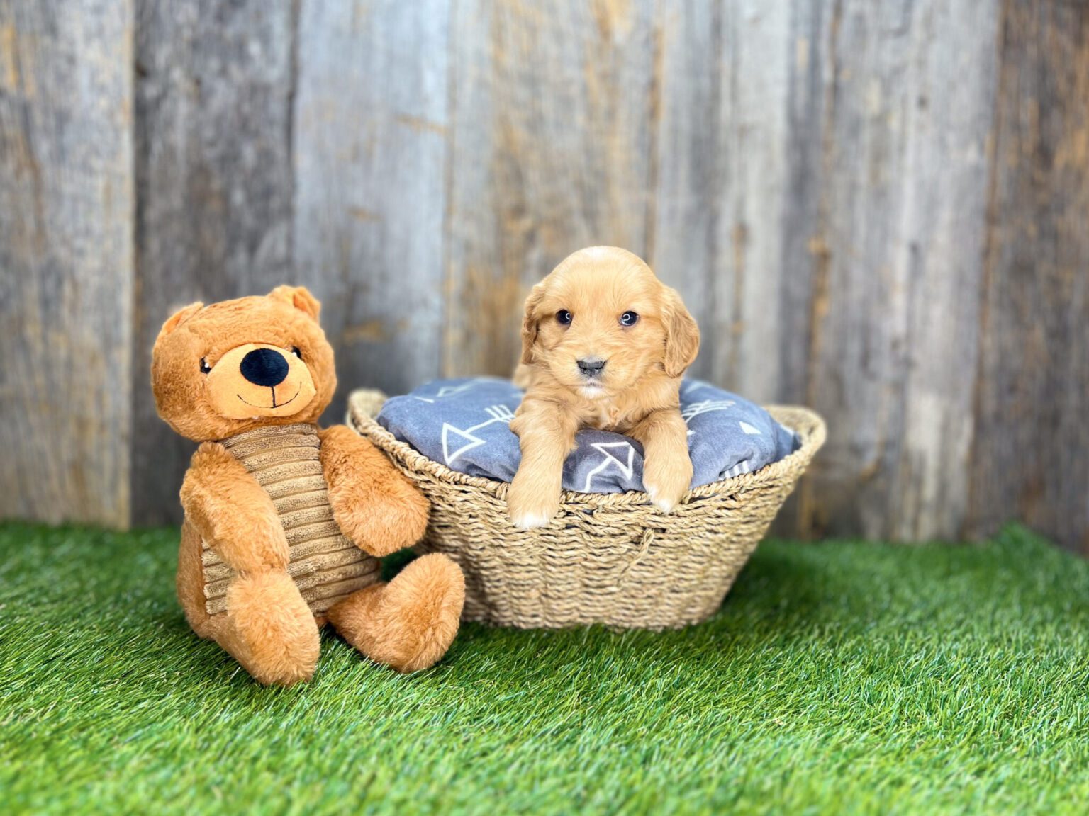 The Miniature Golden Retriever, affectionately known as the Miniature Golden Retriever or Comfort Retriever, is a captivating blend of the Golden Retriever's sunny disposition and the Cavalier King Charles Spaniel's royal elegance. This designer breed inherits the Golden Retriever's friendly, loyal nature and the Cavalier's gentle, affectionate demeanor, making them perfect companions for a wide variety of families and living situations. Miniature Golden Retrievers are celebrated for their adaptability, fitting seamlessly into the hearts and homes of their owners. They possess an innate intelligence and a keen eagerness to please, traits that facilitate both training and everyday interactions. With a personality that's as golden as their coat, these dogs are not just pets but deeply integrated family members who share in the joys and comforts of home life. Whether it's a leisurely walk in the park or a cozy evening at home, the Miniature Golden Retriever promises a lifetime of loyalty, warmth, and the irreplaceable joy of a devoted companion.